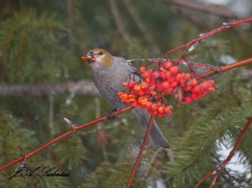» Female Pine Grosbeak and Mountain Ash Berries